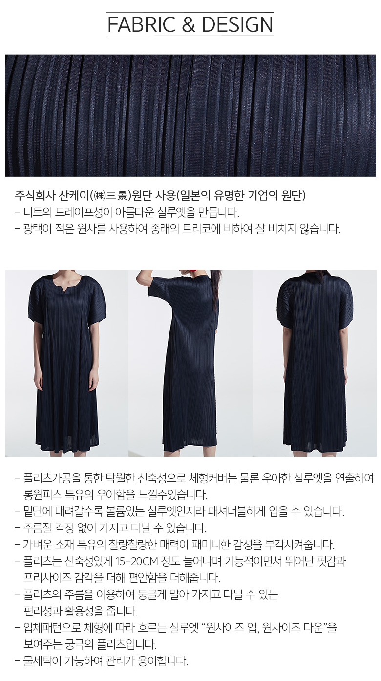 - 플리츠 가공을 통해 신축성이 뛰어나 체형을 커버할 뿐만 아니라 롱 드레스 특유의 우아한 실루엣을 연출합니다.